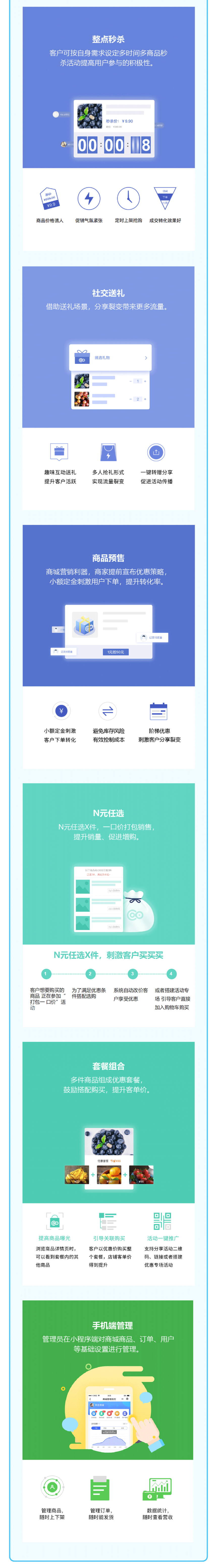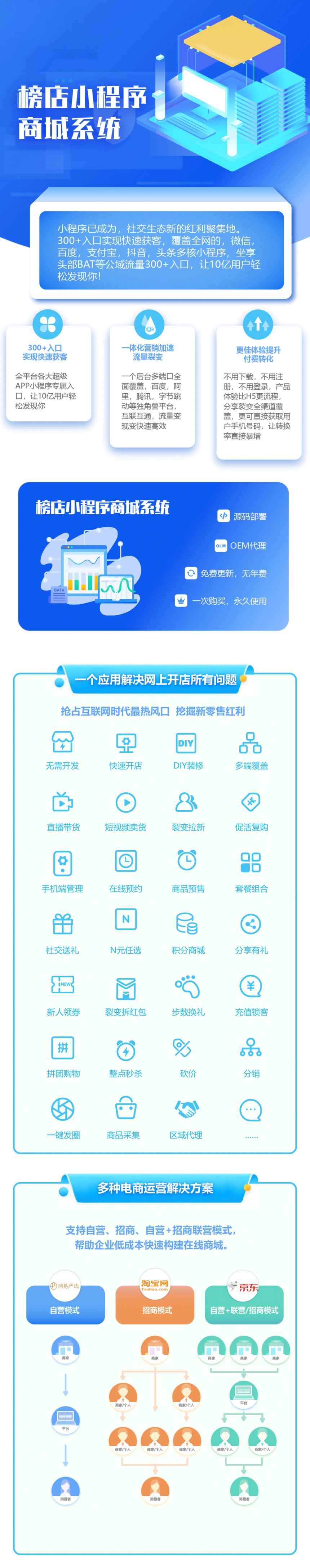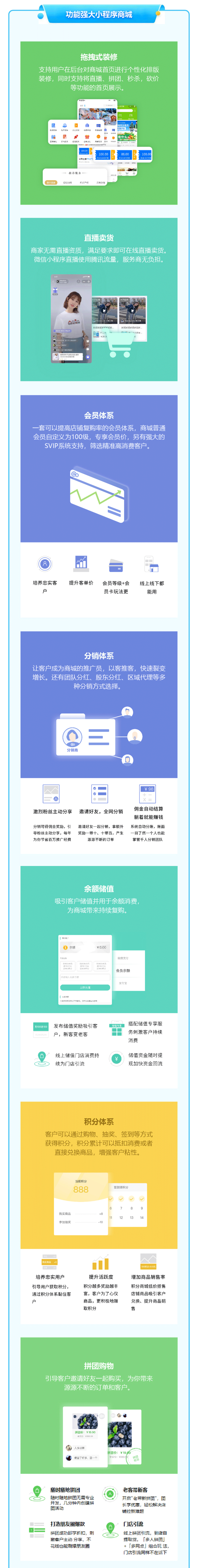 无需开发 快速开店 DIY装修 多端覆盖 直播带货 短视频卖货 裂变拉新 促活复购 手机端管理 在线预约 商品预售 套餐组合 社交送礼 N元任选 积分商城 分享有礼 新人领券 裂变拆红包 步数换礼 充值锁客 拼团购物 整点秒杀 砍价 分销 一键发圈 商品采集 区域代理